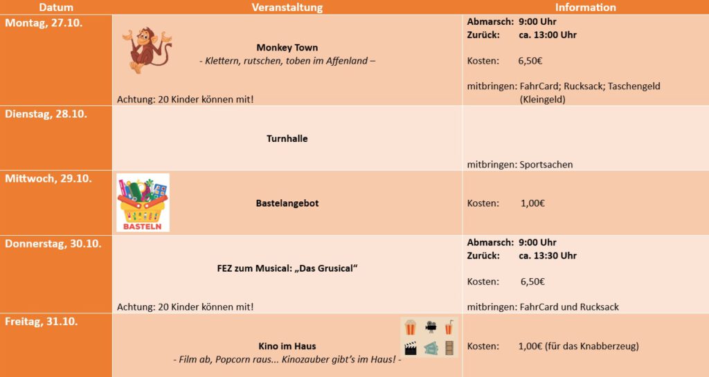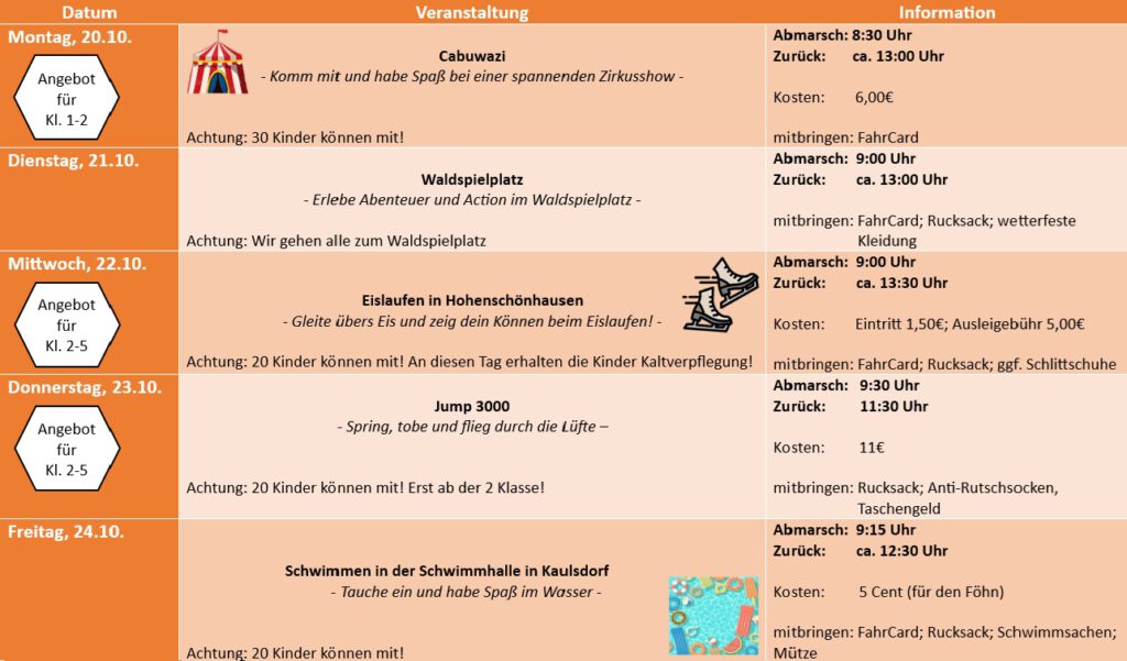 - Um bei den Angeboten und Ausflügen dabei zu sein, solltet ihr rechtzeitig in der Schule sein (siehe Plan!)
